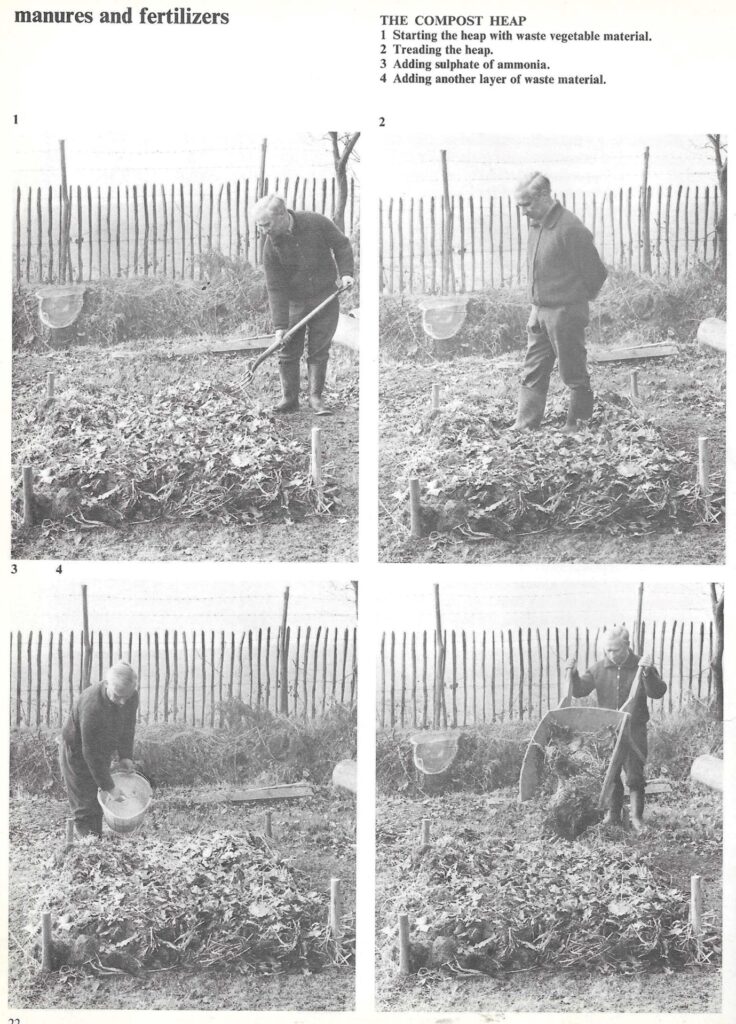 Mark out some flat firm land 3m by1.2m put waste vegetable mater to form the first layer in the summer put on soft hedge trimming ,grass mowings outer leaves of vegetables and any animal dropping no diseased material should be put on to the heap tread the heap once in a while and sprinkle Sulphate Ammonia at 15g/m2 then sprinkle with36l of water add another layer and add135g/m2 limestone then water361l sprinkled on water weekly if hot and dry