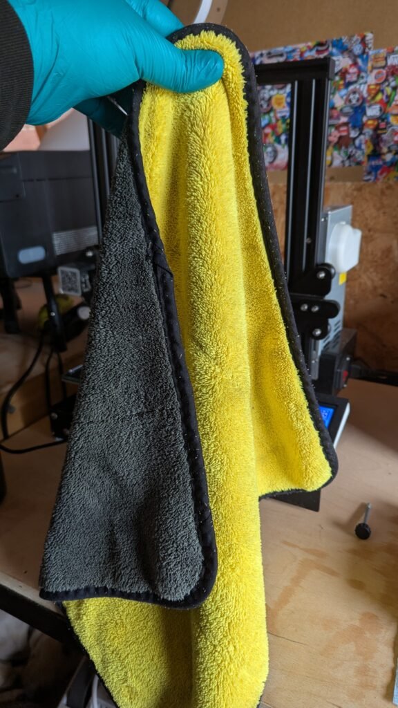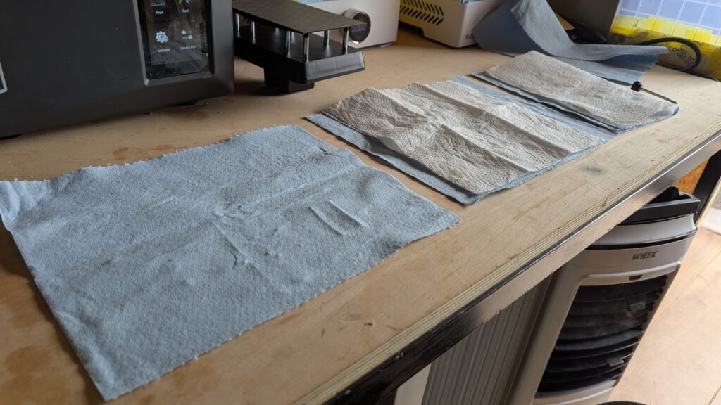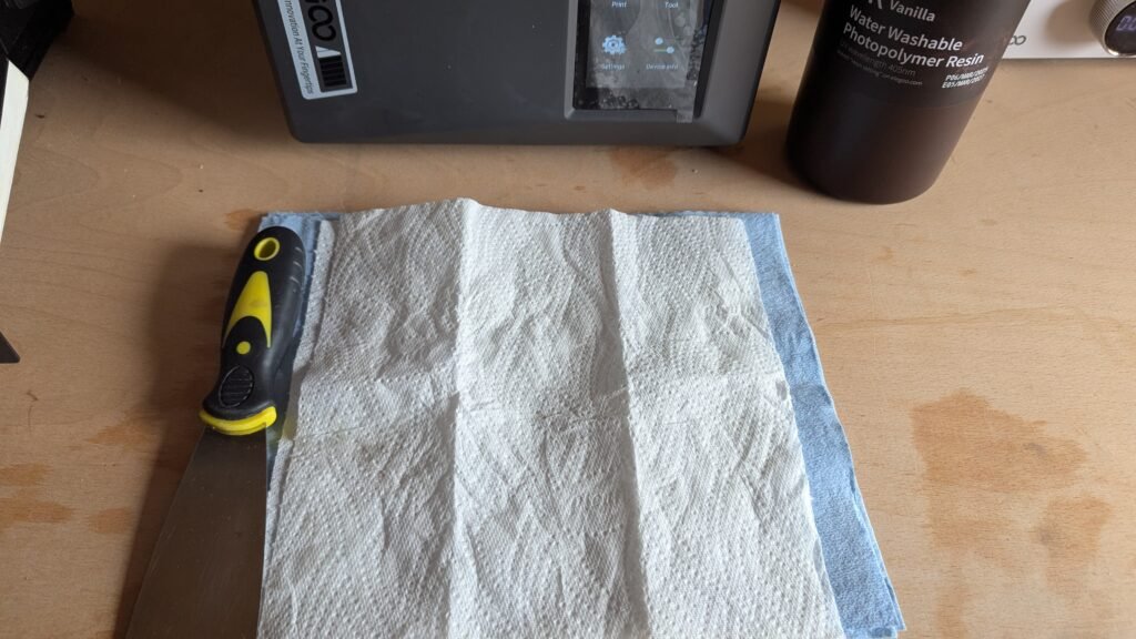 I work in a close workspace and my printers are very close to me and my working place, I always open my windows full and both my doors fully open and then get 4 blue tissues and split them into one and the have one left over to clean the tank,glass top and the tools, The blue roll get’s it up better and less work, get the kitchen roll and sprit two of them.