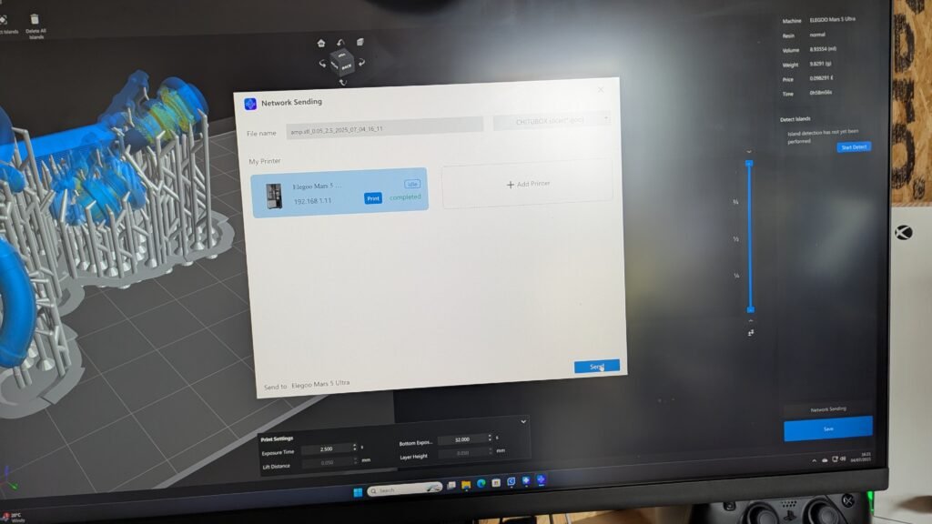 to send to my printer when its sent to the printer I get the tank and but it on the blue roll then put water in the tank then the printer should be ready leave it for a bit get a soft cloth and clean the glass top under the tank will go to get the dust off, Then I go back to the Tank then lift it up if there is no wet patches put it on the printer, If there is a wet patch it need to be fixed, save that blue roll and I will wipe the lid and where the lid goes on the bottle, and use it to keep the yellow/plastic scraper and clean tank, The file will be ready to print then I lift it up for the last time and look then screw it on then I get the build plate wipe it with a soft cloth, (If you have a older printer you will need to level at this part, My printer does it automatic) Then place it on the printer soft so the resin don’t go everywhere, Then I press print the printer will go through everything then start printing.
