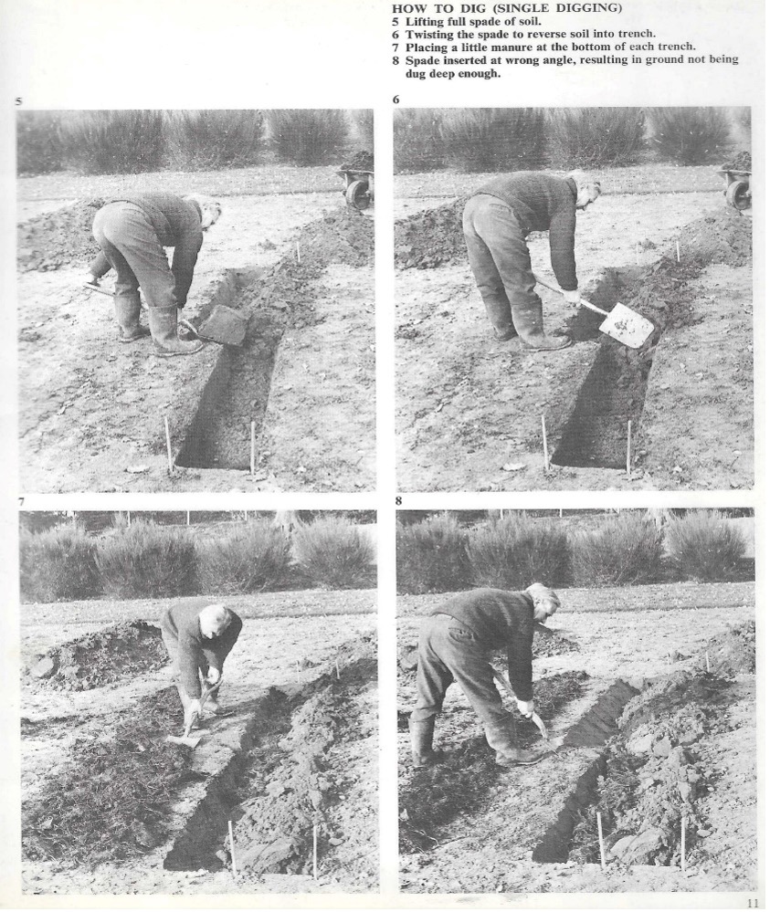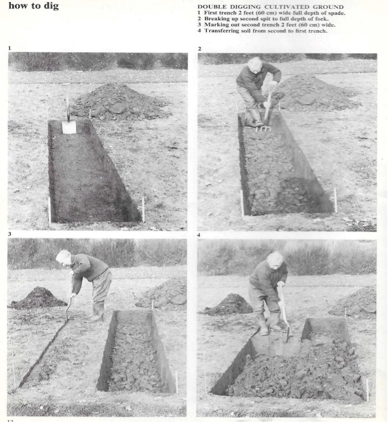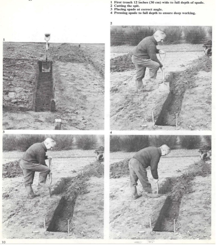 The area of soil to removed is cut to separate it from the rest. Then the spade is thrust into the soil vertically 90 degrees to the soil surface, to the top spade blade. The cuts are made so. As the soil does not crumble when at the of the bottom of trench this done by twisting the soil on the spade as removed off If the soil is covered by grass, then slice off the grass and put to one side once the trench is dug then put the sliced off grass at the bottom of the trench upside down. This will break down. If perennial weeds are found, then this needs to be removed.